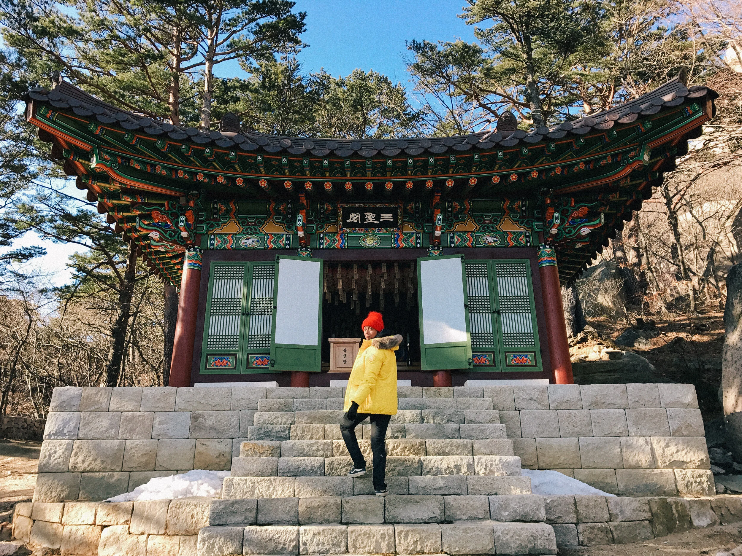 Seoraksan was unlike any National Park I had ever been to in the world; it was both a natural and cultural experience. Sprinkled along the trail were buddhist statues and shrines, and stone etchings. The trail started pretty flat, and before we had even walked a mile, we arrived at a very cute coffee hut where I couldn’t resist taking a totally undeserved break for a matcha latte. Once we got moving again, we had to keep stops to a minimum in order to stay warm in the 15 degree cold. As the trail started to climb, we still didn’t quite know what or where our destination was, until a metal framed stairway hanging on the side of a rocky mountain came into sight. At this point I wasn’t much of a hiker, so I was pretty intimidated by the thousand feet of straight climbing that lay ahead of me.